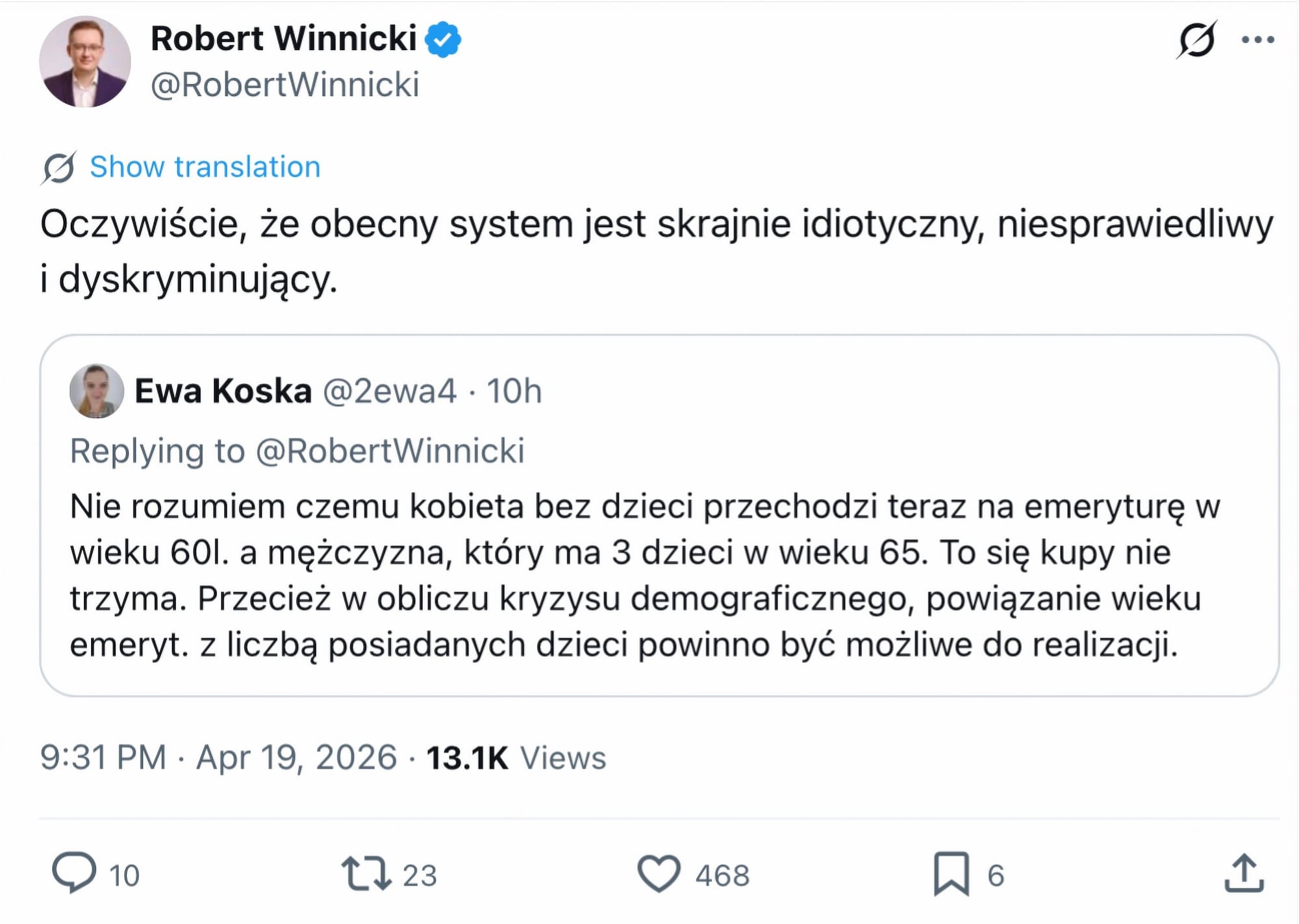 Problem w tym, że to tego samego rodzaju bełkot, co wyśmiany właśnie przez Winnickiego w kontekście emerytur. Pary różnopłciowe mają prawo zawrzeć małżeństwo czy mają dzieci, czy nie mają. Różnopłciowa para emerytów może zawrzeć małżeństwo, że wszystkiego jego „przywilejami”, choć przynajmniej kobieta nie będzie już nawet biologicznie zdolna do zajścia w ciążę.
