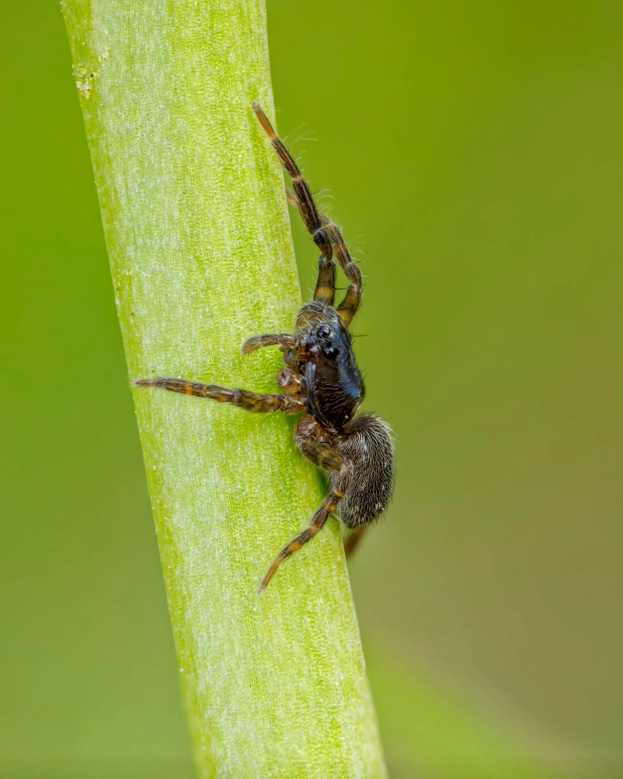 Na tym samym spacerze, stosując podobne kroki, udało mi się jeszcze złapać tego pająka, znacznie mniejszego (nie miał nawet pół centymetra), ale nie potrafię nawet w przybliżeniu określić jego przynależności gatunkowej: