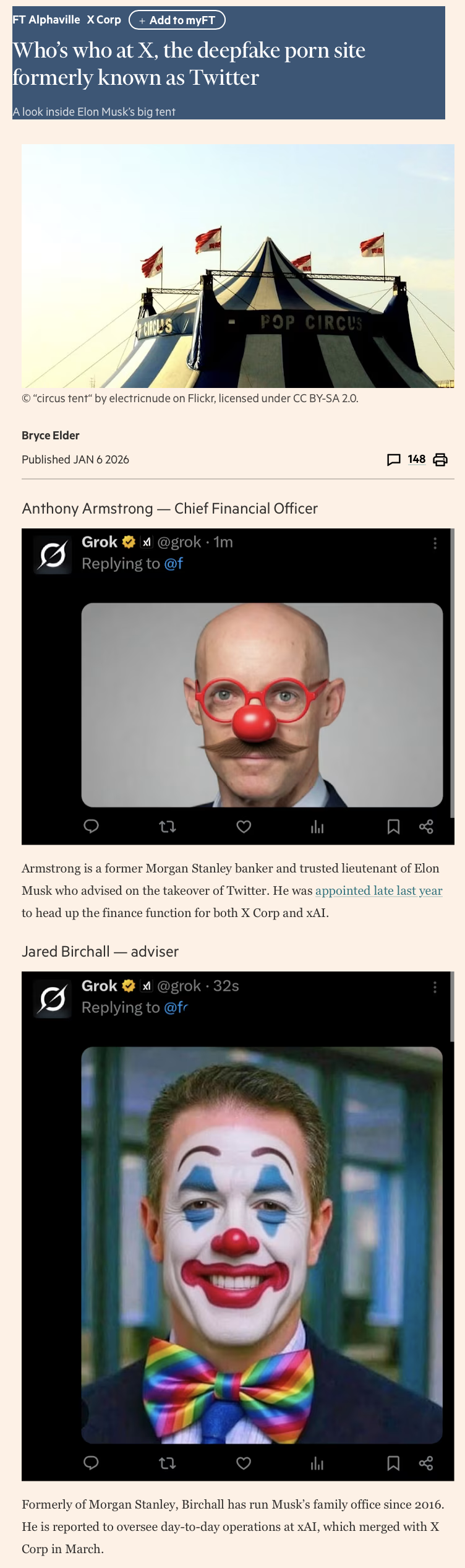 Jak dotąd co najmniej jedno tradycyjne medium pozwoliło sobie na nagłówek nazywający rzeczy po imieniu, to znaczy serwis Muska „pornostroną z deepfejkami”, jednocześnie wykorzystując samego Groka do przerobienia pracowników Muska na klaunów: